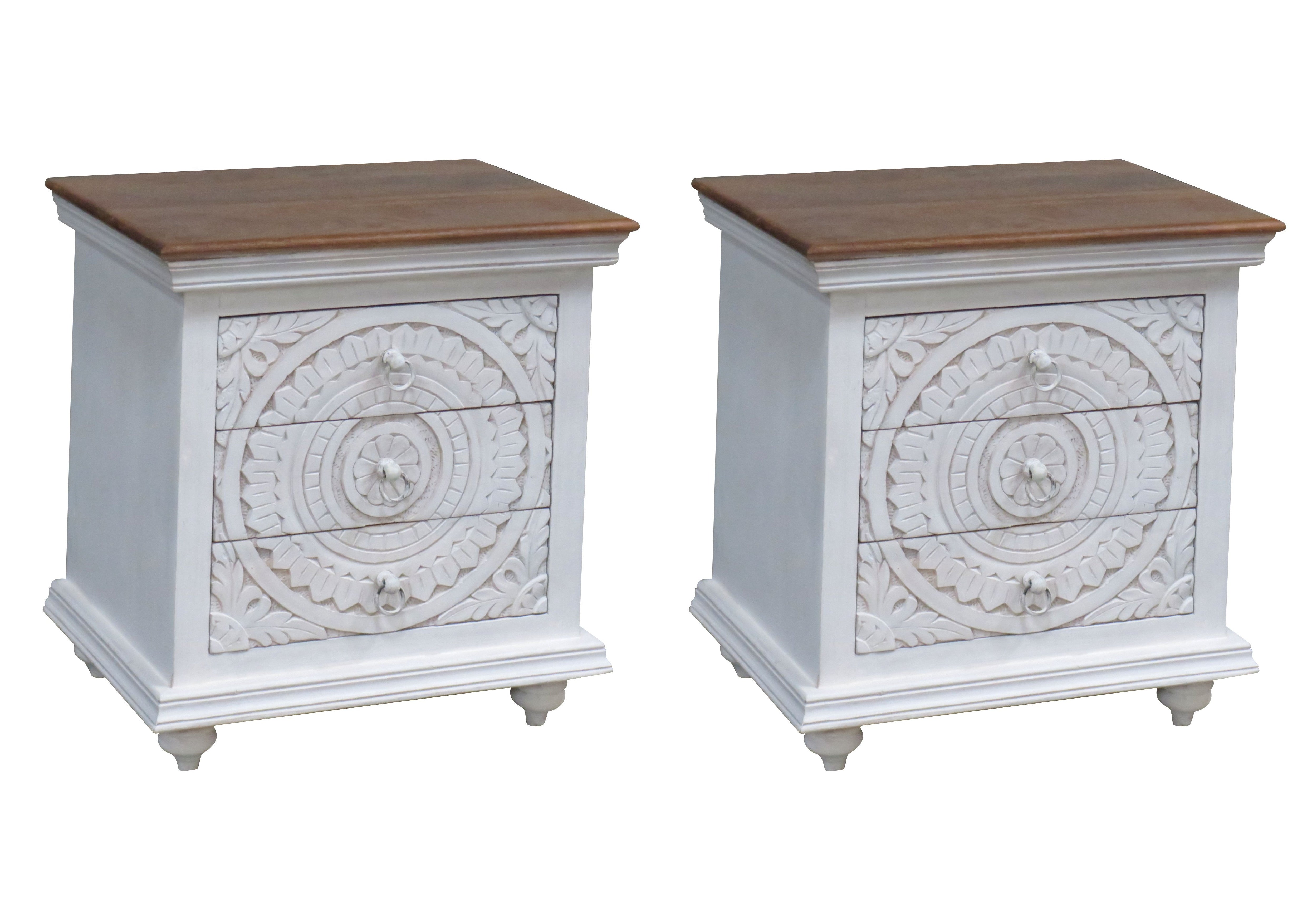 Décoré de manière imaginative avec des ornements sculptés à la main, cette magnifique table de nuit à 3 tiroirs sublimera votre chambre à coucher.