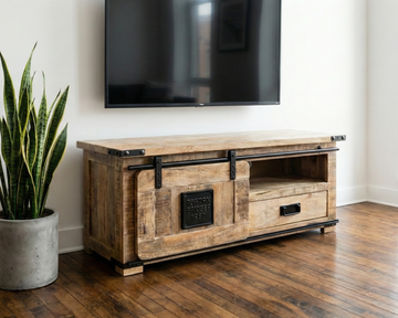Le meuble vidéo Manufacture met en valeur la richesse du manguier massif à travers un design brut et expressif.