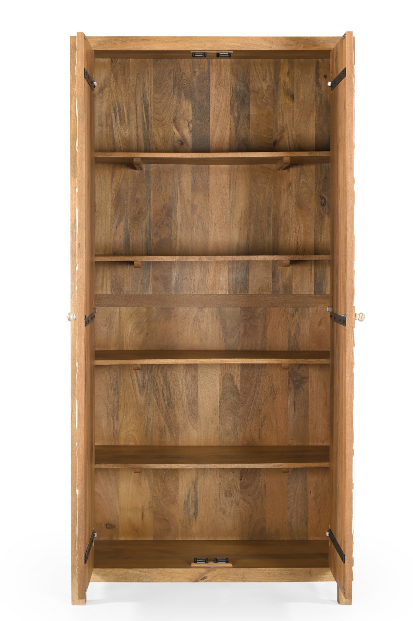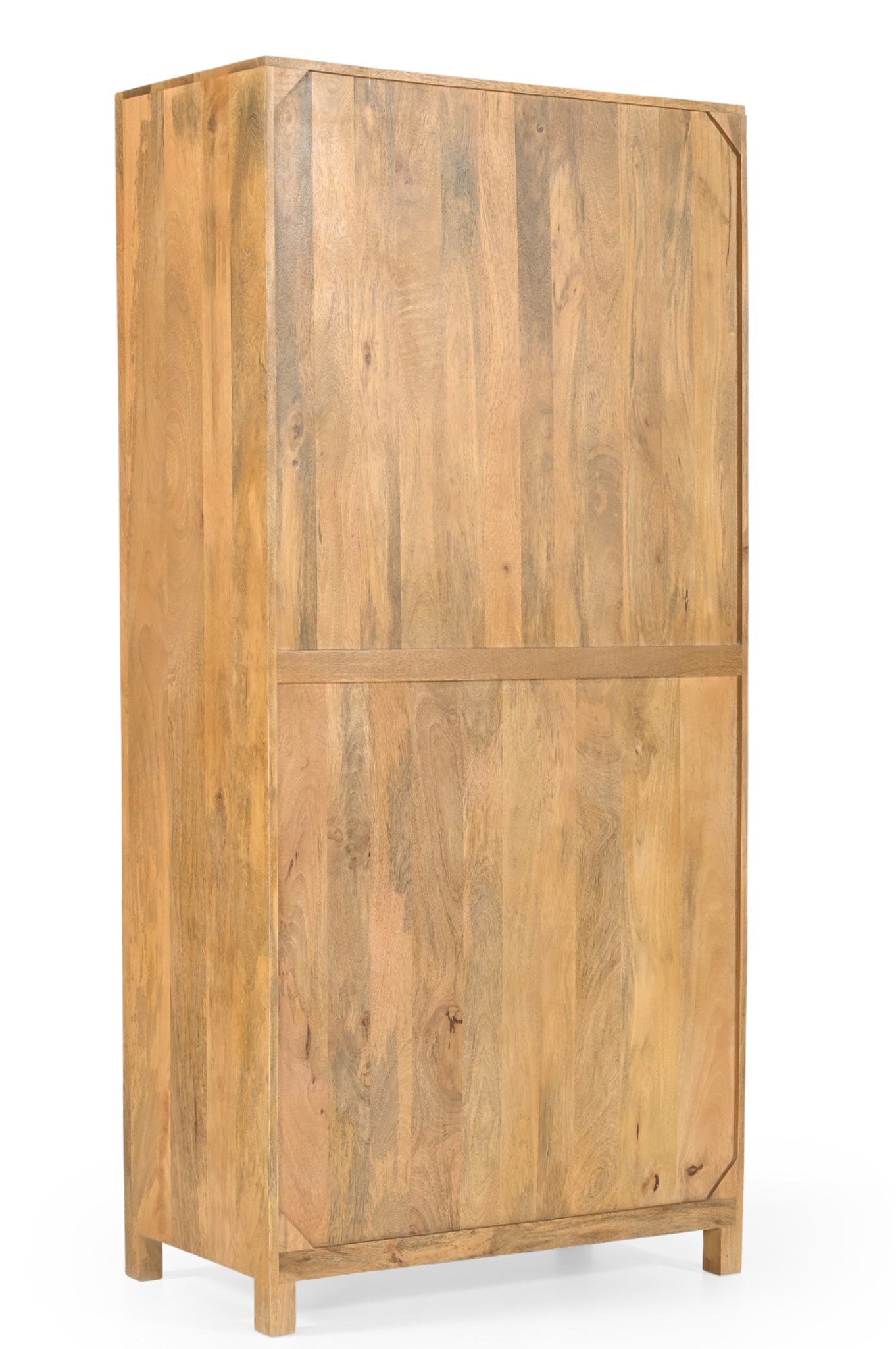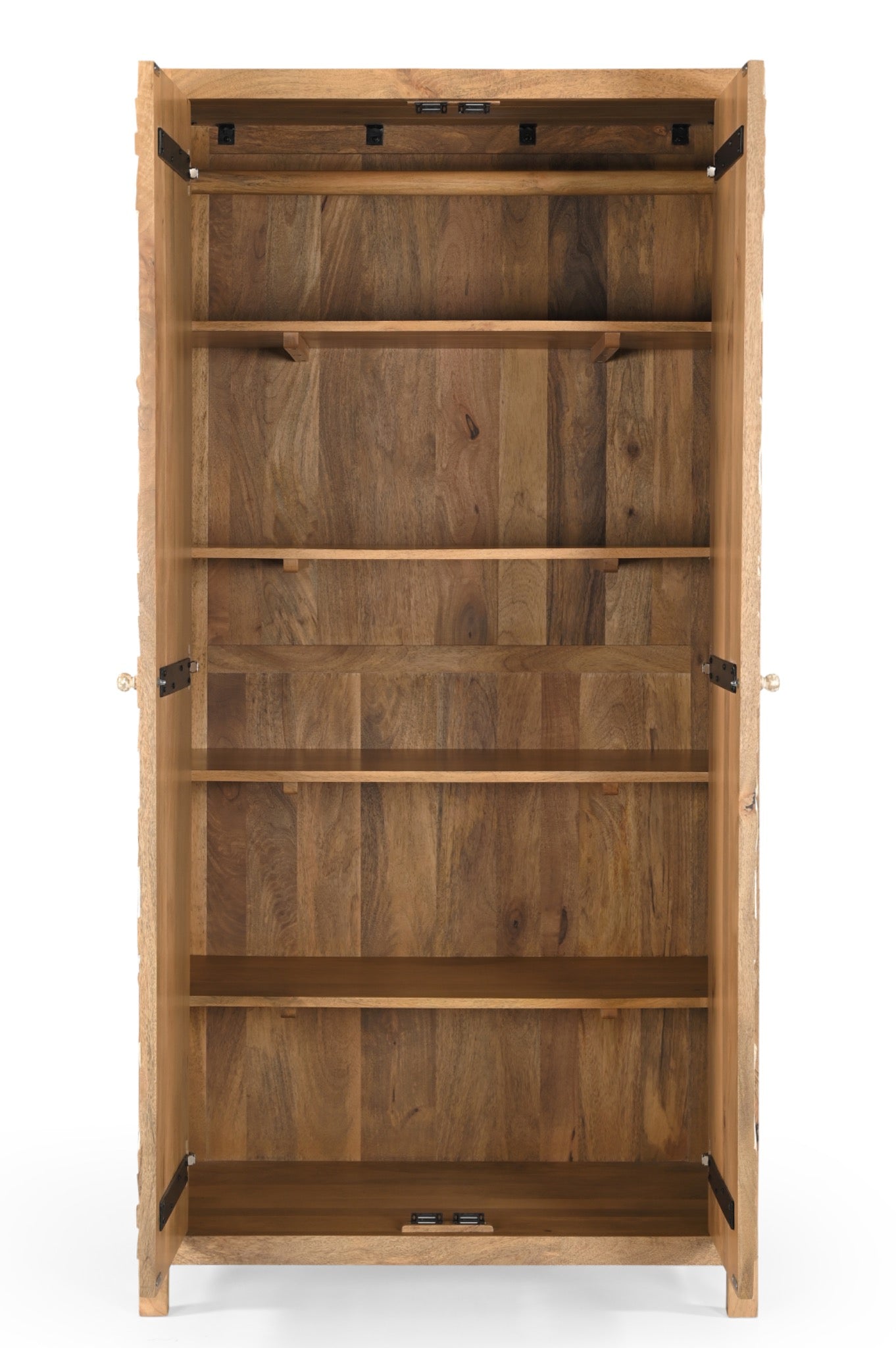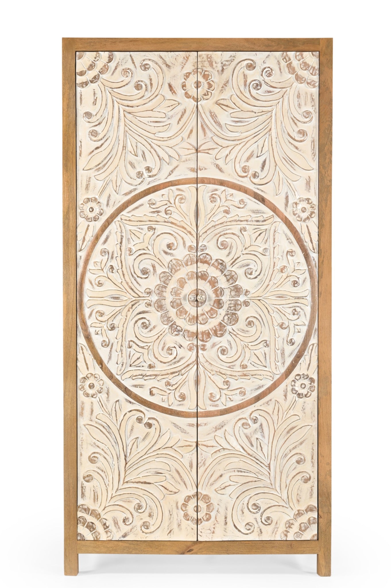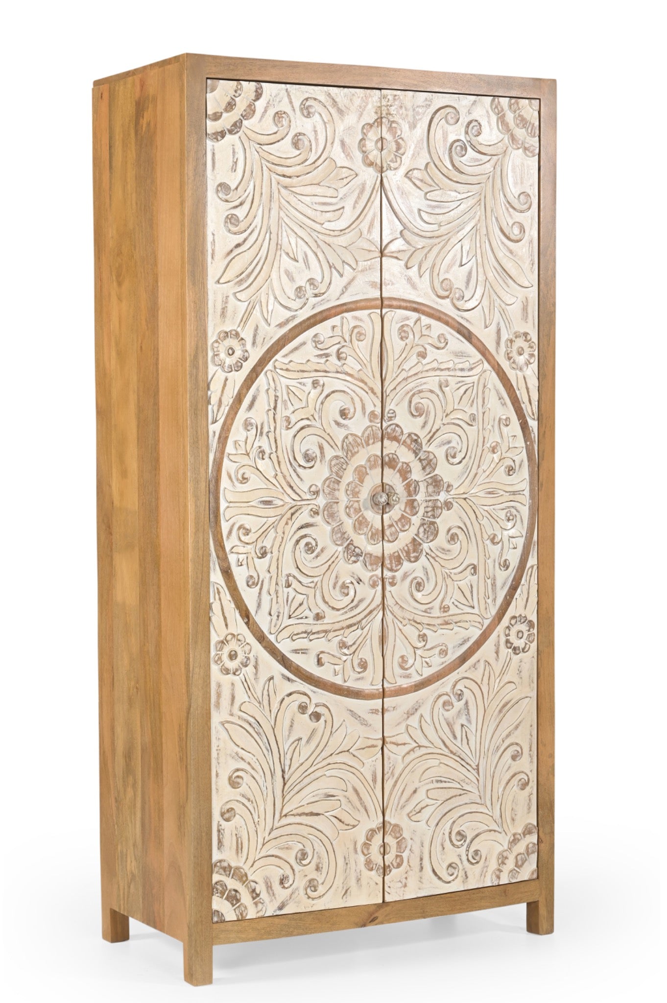 L’armoire Goa est une pièce imposante et élégante qui apporte du caractère à la chambre tout en offrant une solution de rangement généreuse. Réalisée en bois massif de manguier, elle séduit par ses portes finement sculptées à la main avec des motifs floraux inspirés de l’artisanat indien.