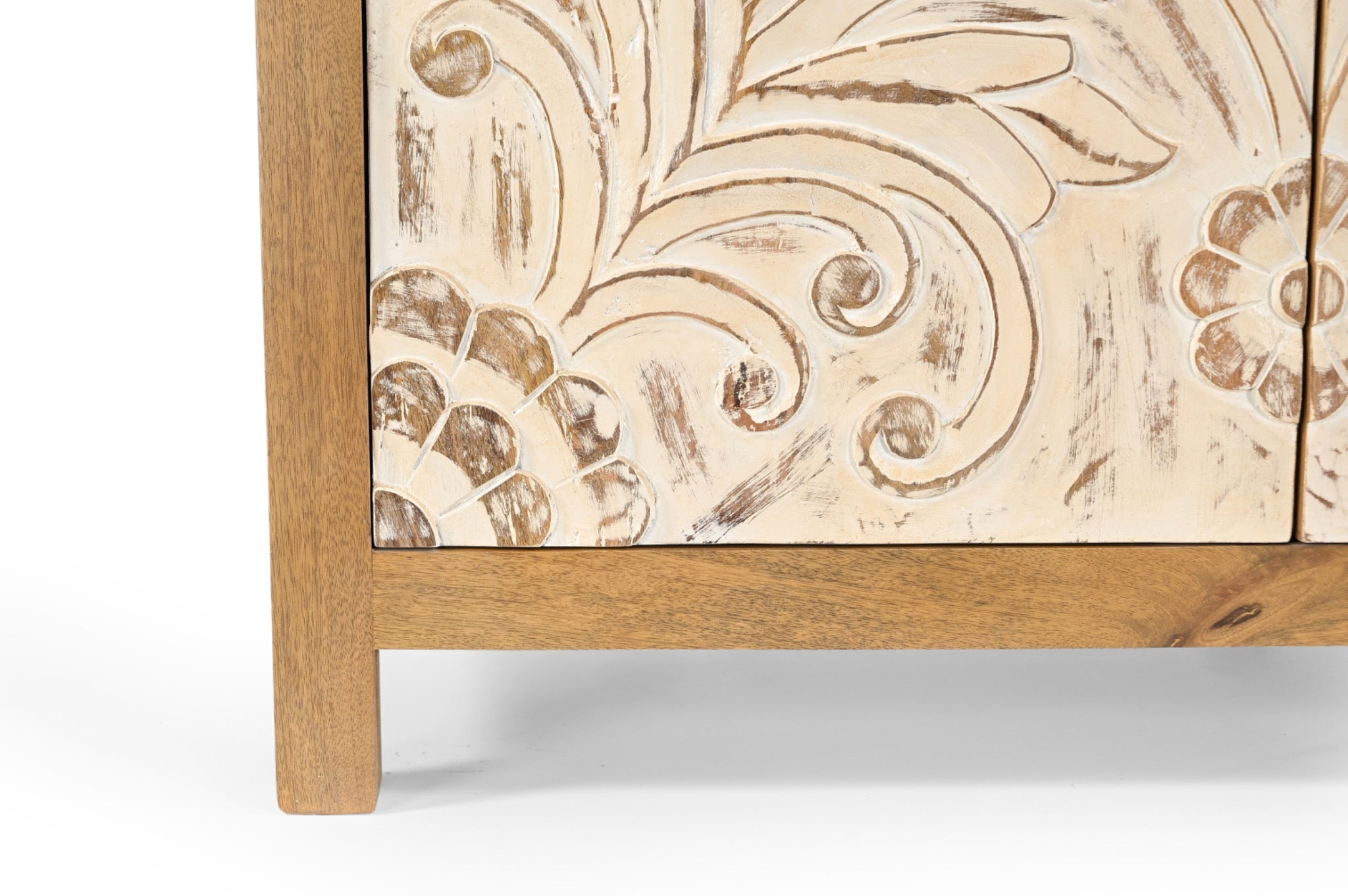 Avec son style bohème chic et exotique, elle s’intègre parfaitement dans une chambre chaleureuse, qu’elle soit contemporaine ou d’inspiration ethnique. Sa finition patinée blanche et naturelle met en valeur la texture unique du bois et l’authenticité des sculptures.