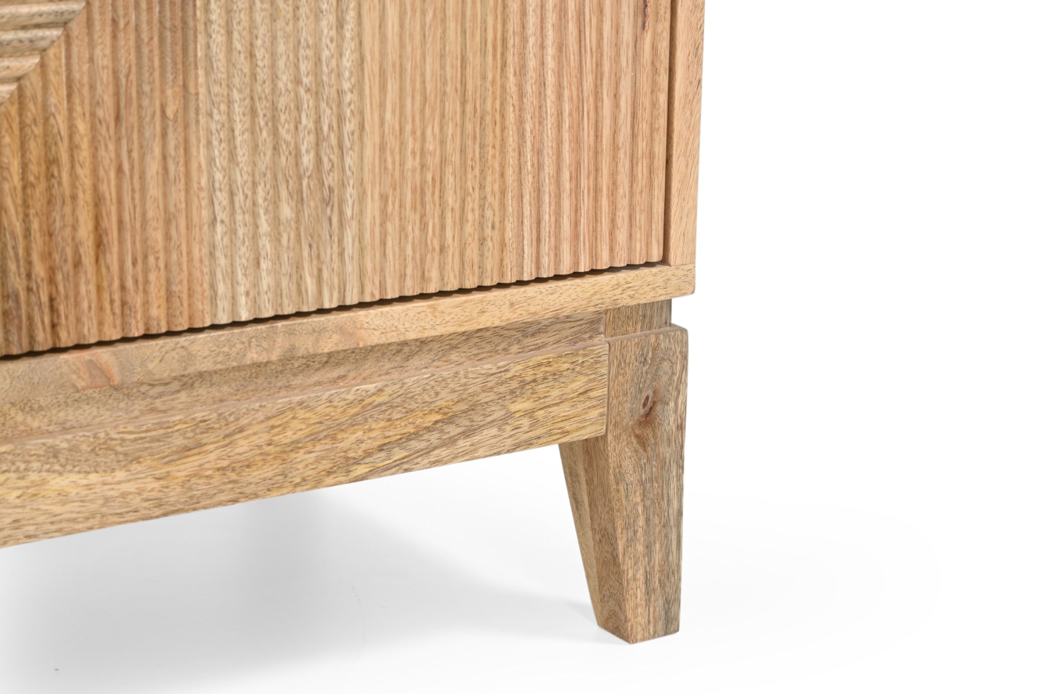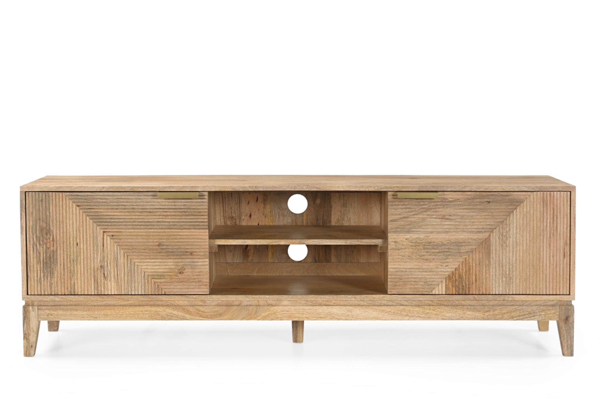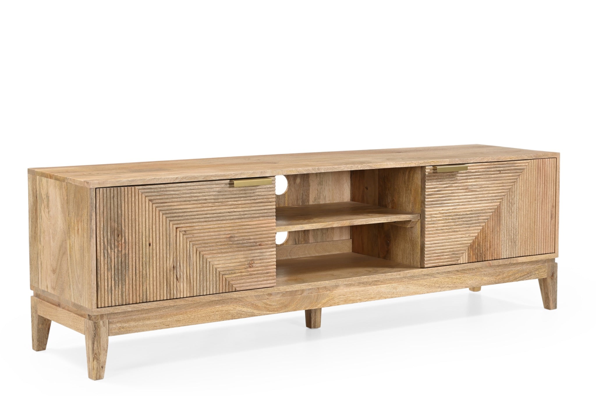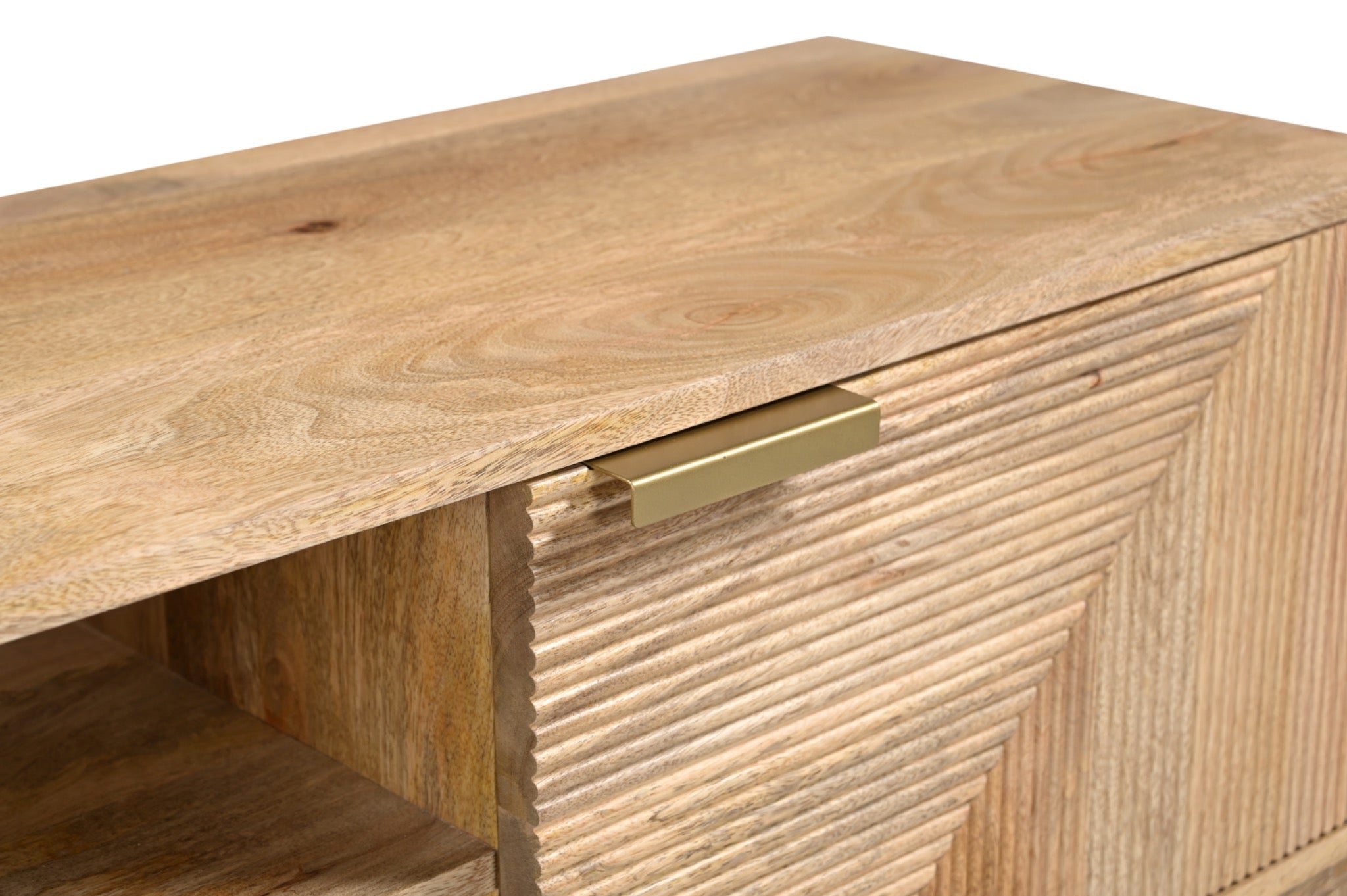 Apportez authenticité et élégance à votre salon avec le meuble TV Jerapa, conçu en bois de manguier massif naturel. Ses lignes épurées et son design géométrique travaillé sur les portes lui confèrent un style à la fois moderne et chaleureux.