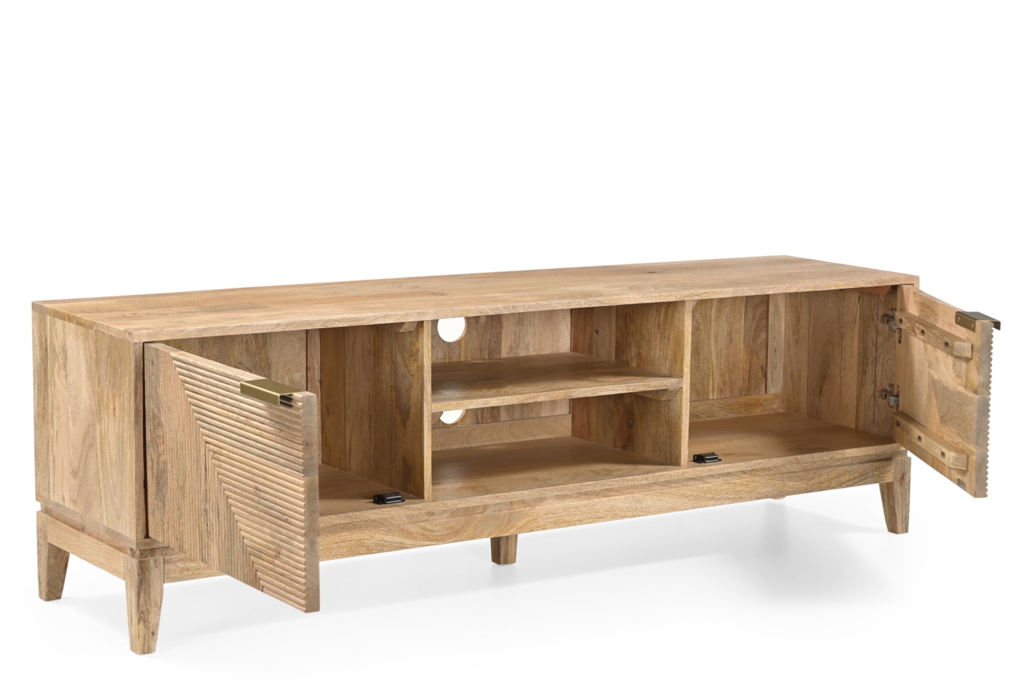 Le meuble vidéo Jerapa est la pièce maîtresse idéale pour sublimer votre salon tout en apportant une touche de caractère grâce à la richesse du bois de manguier.