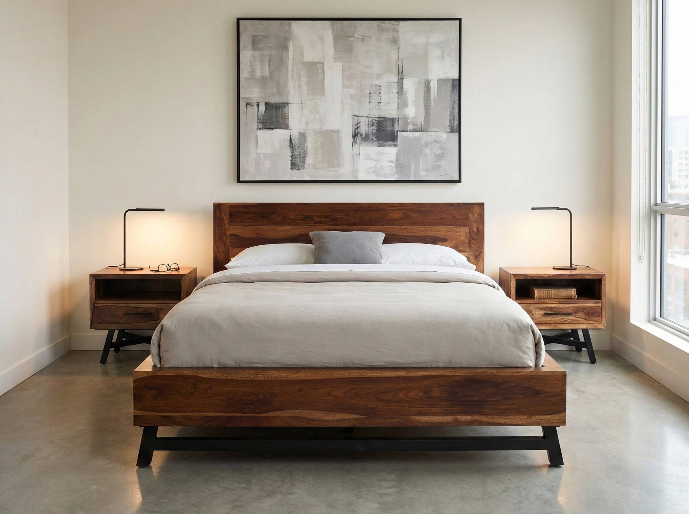 Le cadre de lit Loft est fabriqué en bois de sheesham massif, reconnu pour sa densité, sa robustesse et ses veinures expressives.