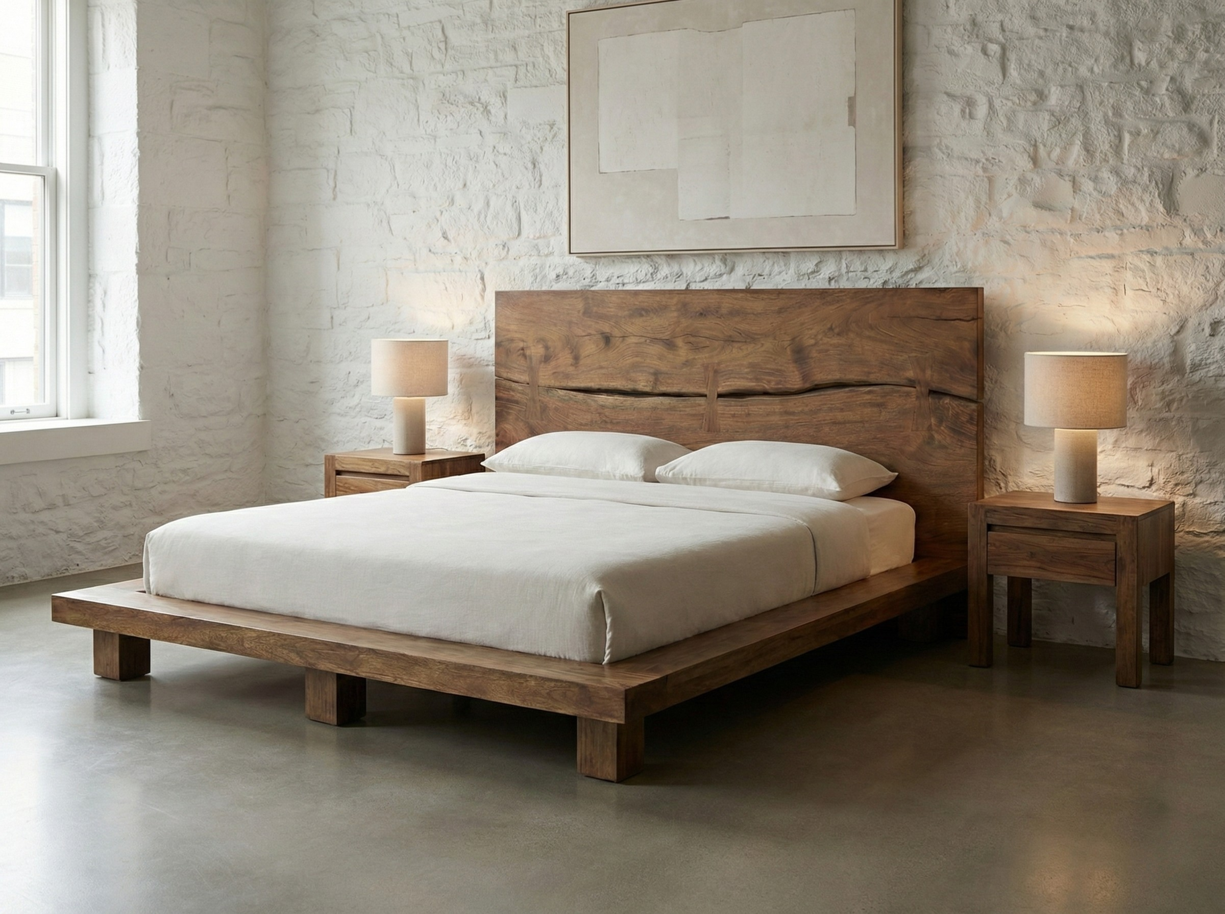 Sa structure basse et affirmée renforce la sensation de solidité et de sérénité dans l’espace nuit.