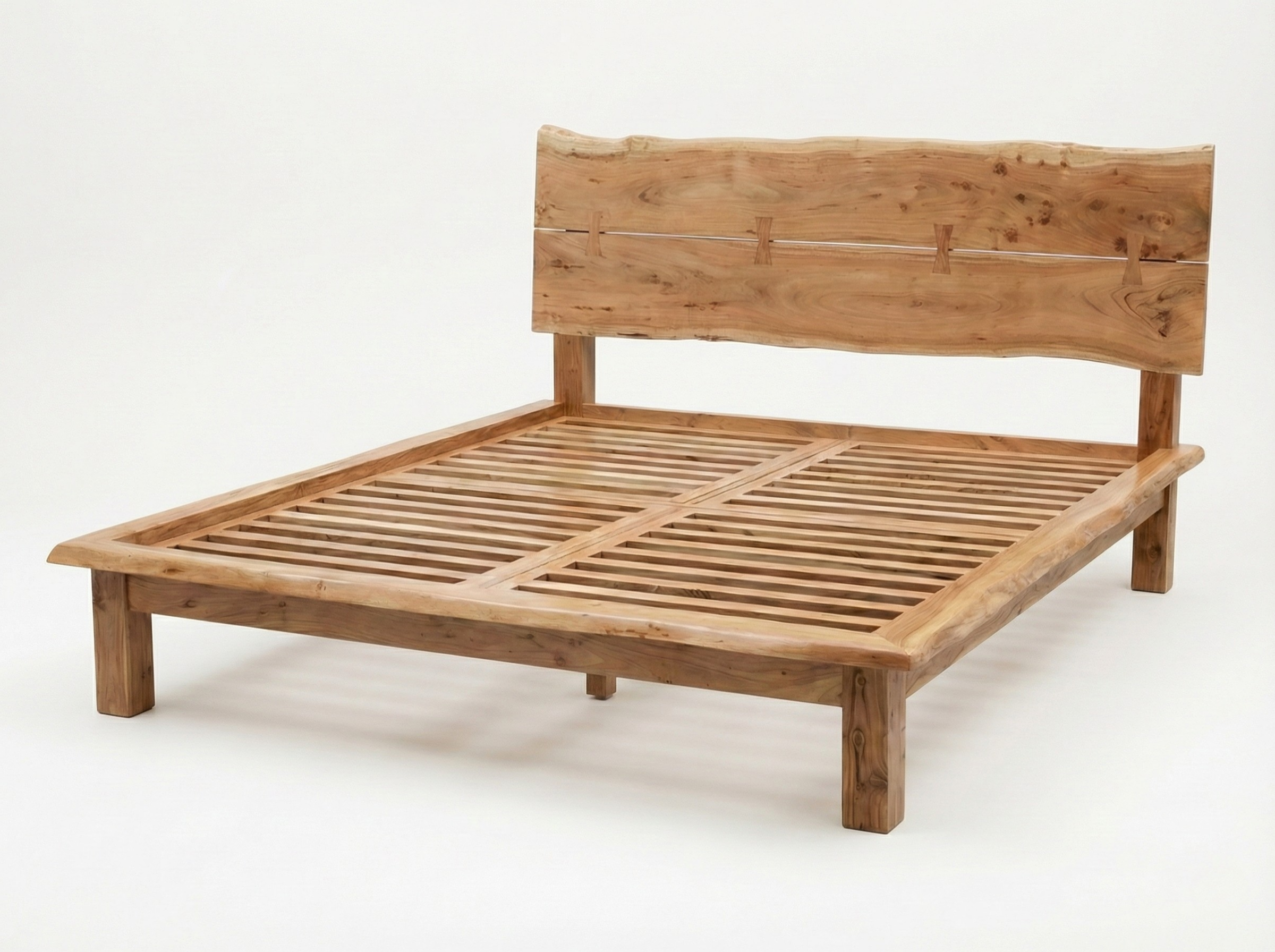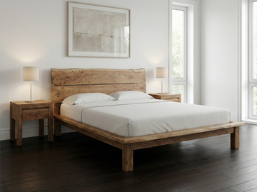La tête de lit met en valeur les formes naturelles du bois, offrant un rendu brut, équilibré et résolument contemporain.