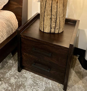 La table de chevet Nagpur : Dotée de deux tiroirs spacieux, elle offre un rangement pratique tout en sublimant votre espace de repos.