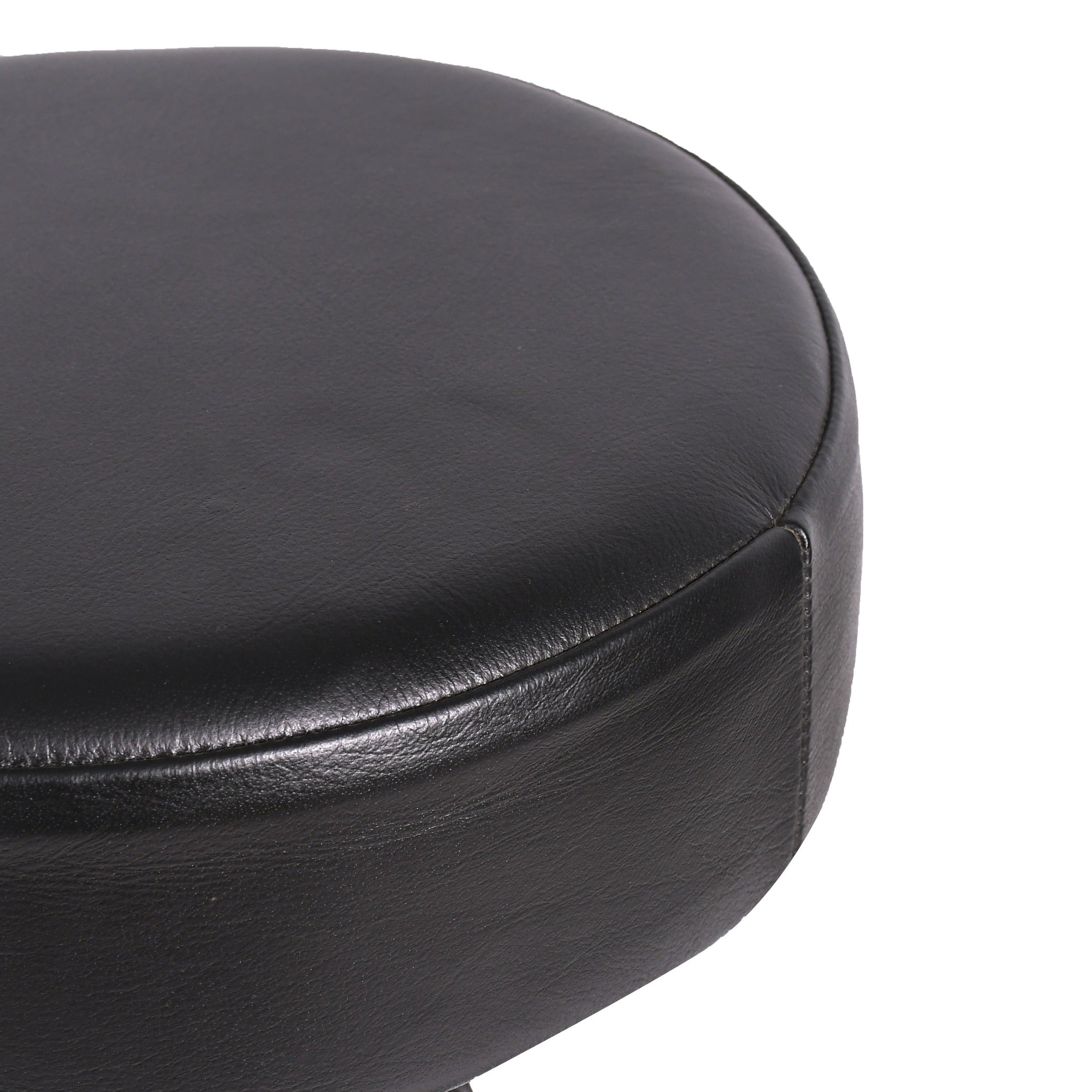 Son assise ronde en cuir véritable noir, rembourrée et confortable, offre un excellent maintien. Le piètement circulaire en métal assure une grande stabilité, tandis que la finition noire donne une allure brute et authentique.