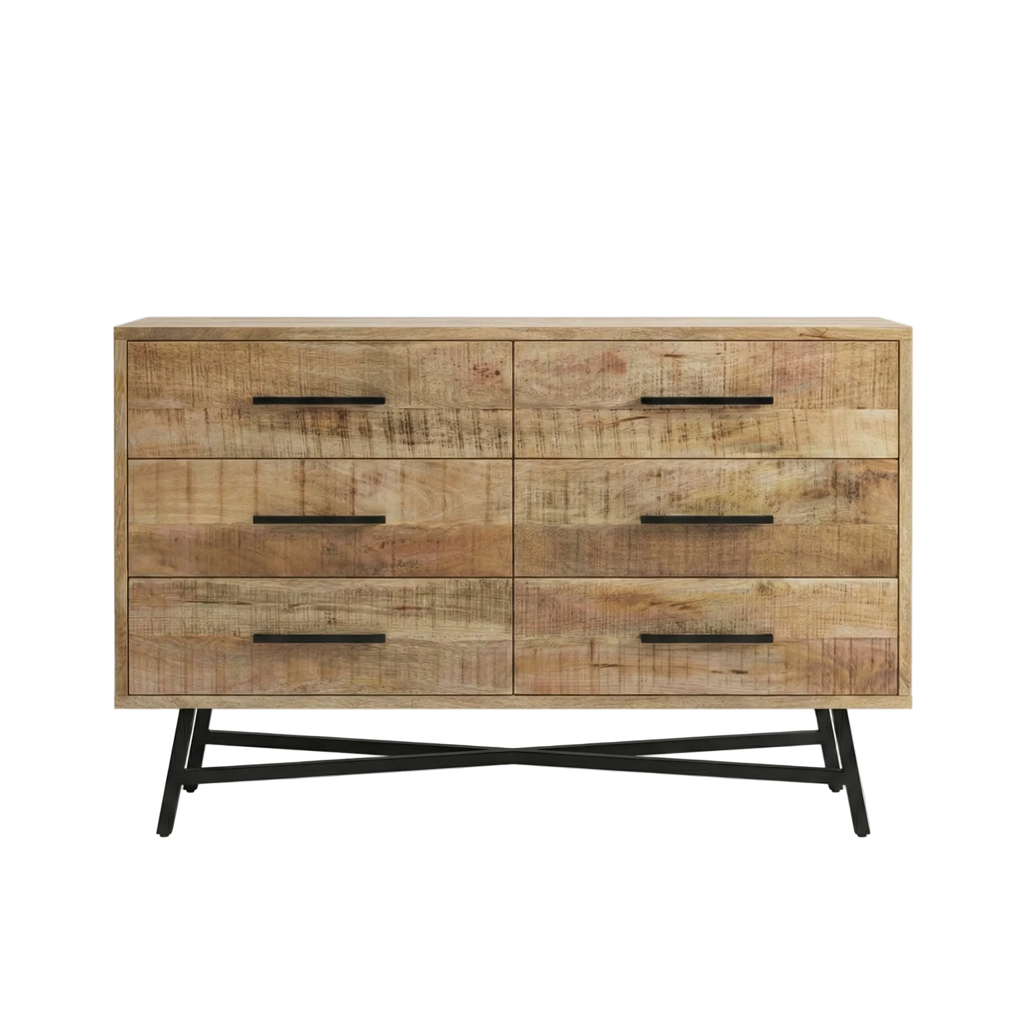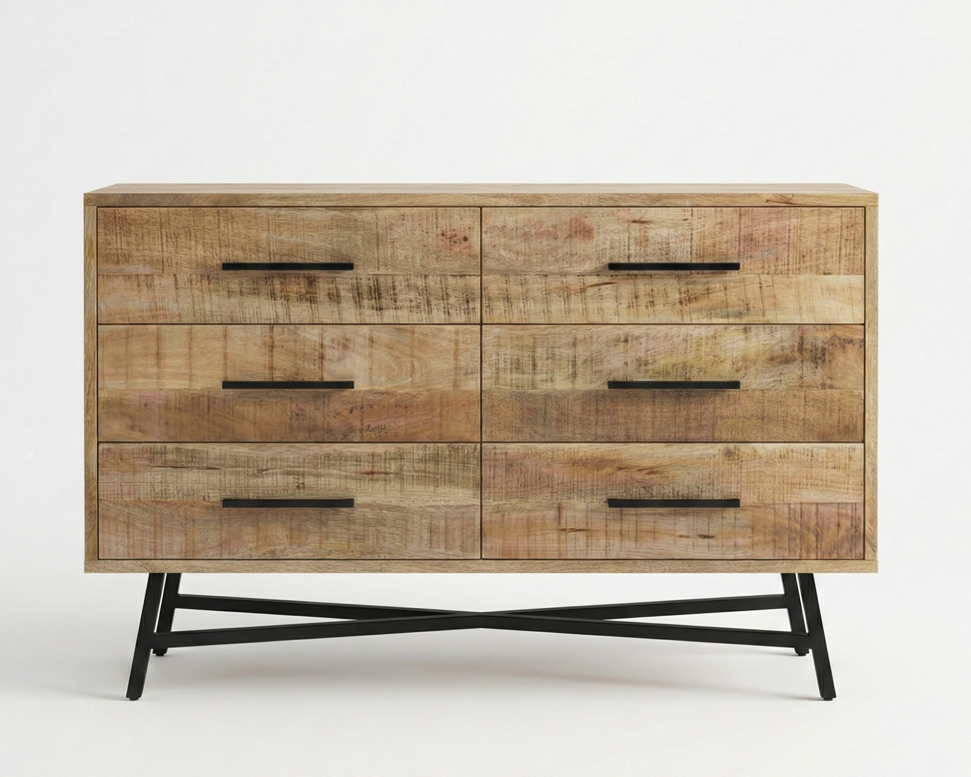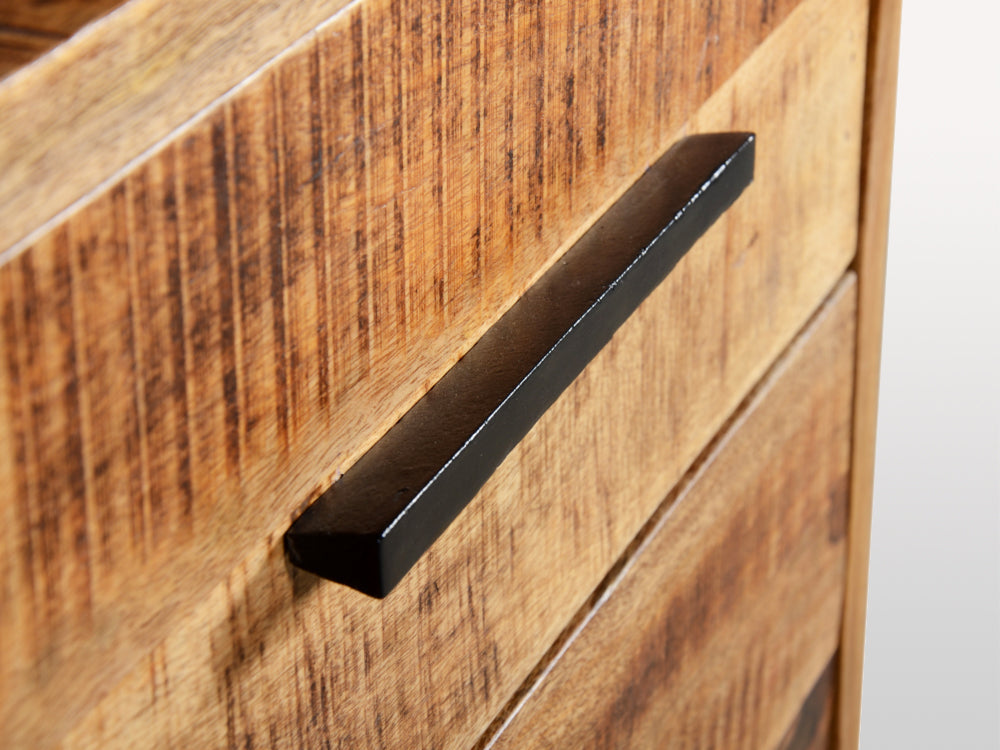 Entièrement réalisée en manguier massif, la commode Retro repose sur une structure pleine et stable, renforcée par un piètement métal noir assurant rigidité et excellente tenue dans le temps.