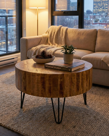 La table basse ronde Leeds affirme une présence forte grâce à son plateau épais en manguier massif, travaillé comme un bloc plein.