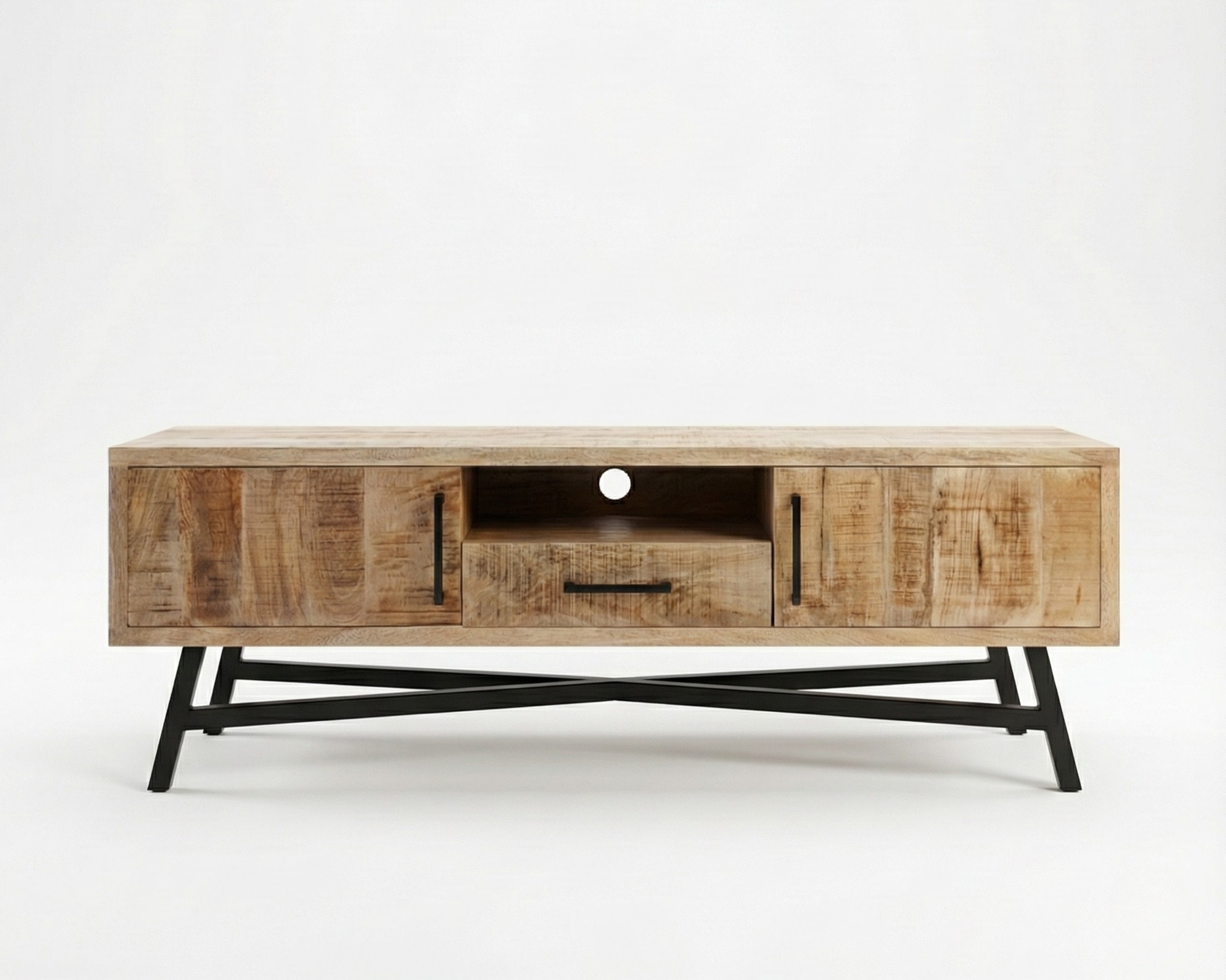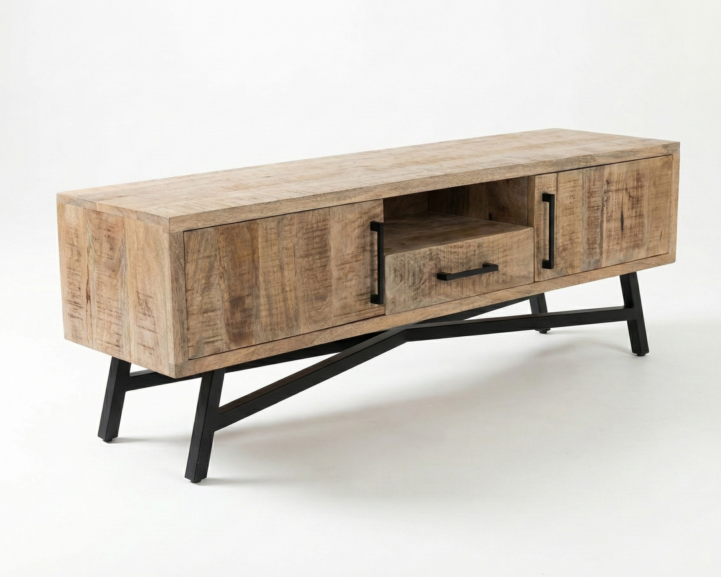 Ce meuble TV associe la chaleur du manguier massif à une base en métal noir aux lignes nettes et géométriques.