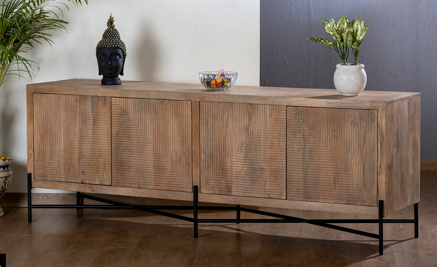 Ce buffet en manguier massif est une pièce design qui se distingue par ses façades au motif géométrique rainuré, sculptées à la main.