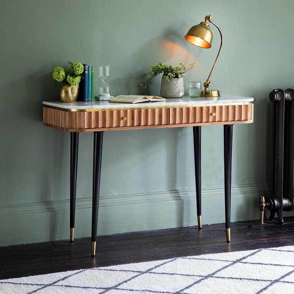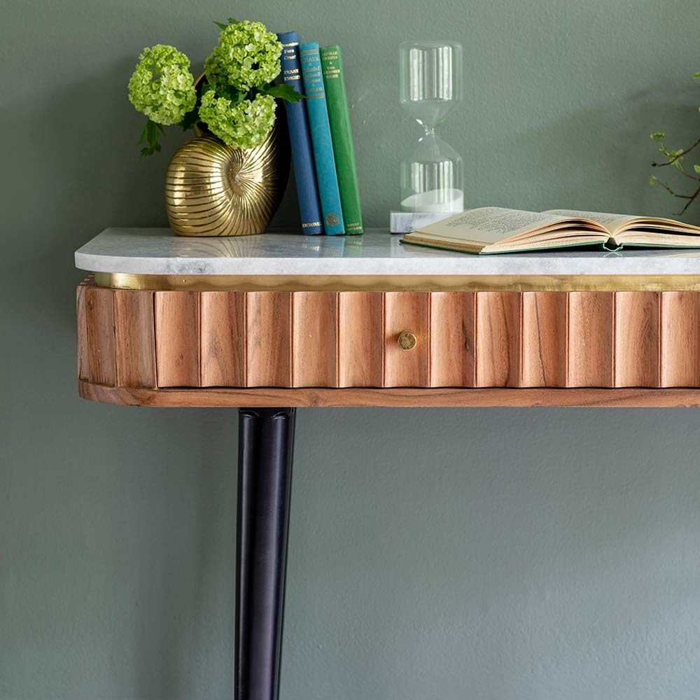 Élégante et raffinée, la console Dalila combine un superbe plateau en marbre blanc naturel avec une structure en bois de manguier massif, sculpté en relief pour un effet visuel unique.