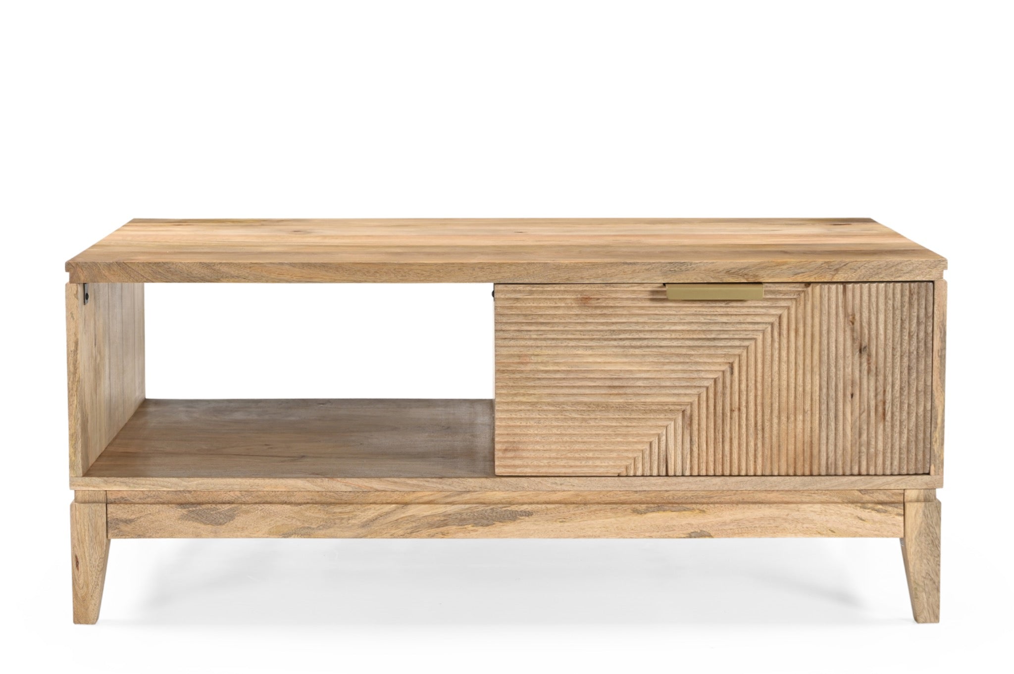 La table basse Jepara est une pièce de caractère qui allie authenticité artisanale et fonctionnalité moderne. Fabriquée en bois de manguier massif naturel, elle se distingue par son design géométrique sculpté sur la façade, sublimé par des poignées discrètes en métal doré.