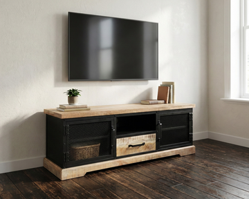 Le meuble TV Lenox affirme un style industriel assumé, où le manguier massif révèle toute sa texture naturelle, contrastée par une structure en métal noir au rendu graphique et robuste.