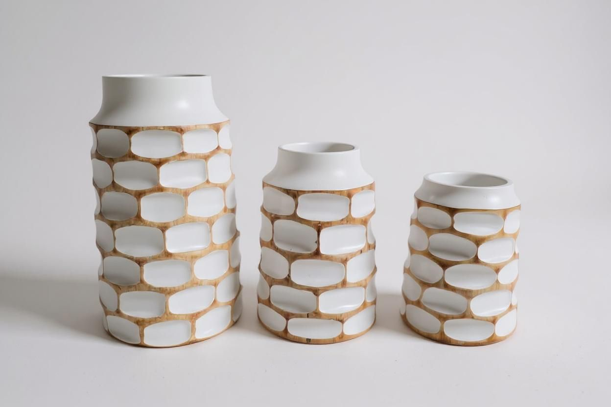 Proposés en trois tailles différentes, ces vases s’harmonisent parfaitement ensemble ou séparément pour créer une décoration originale. Ils peuvent accueillir des fleurs séchées ou être présentés seuls comme pièces décoratives uniques.