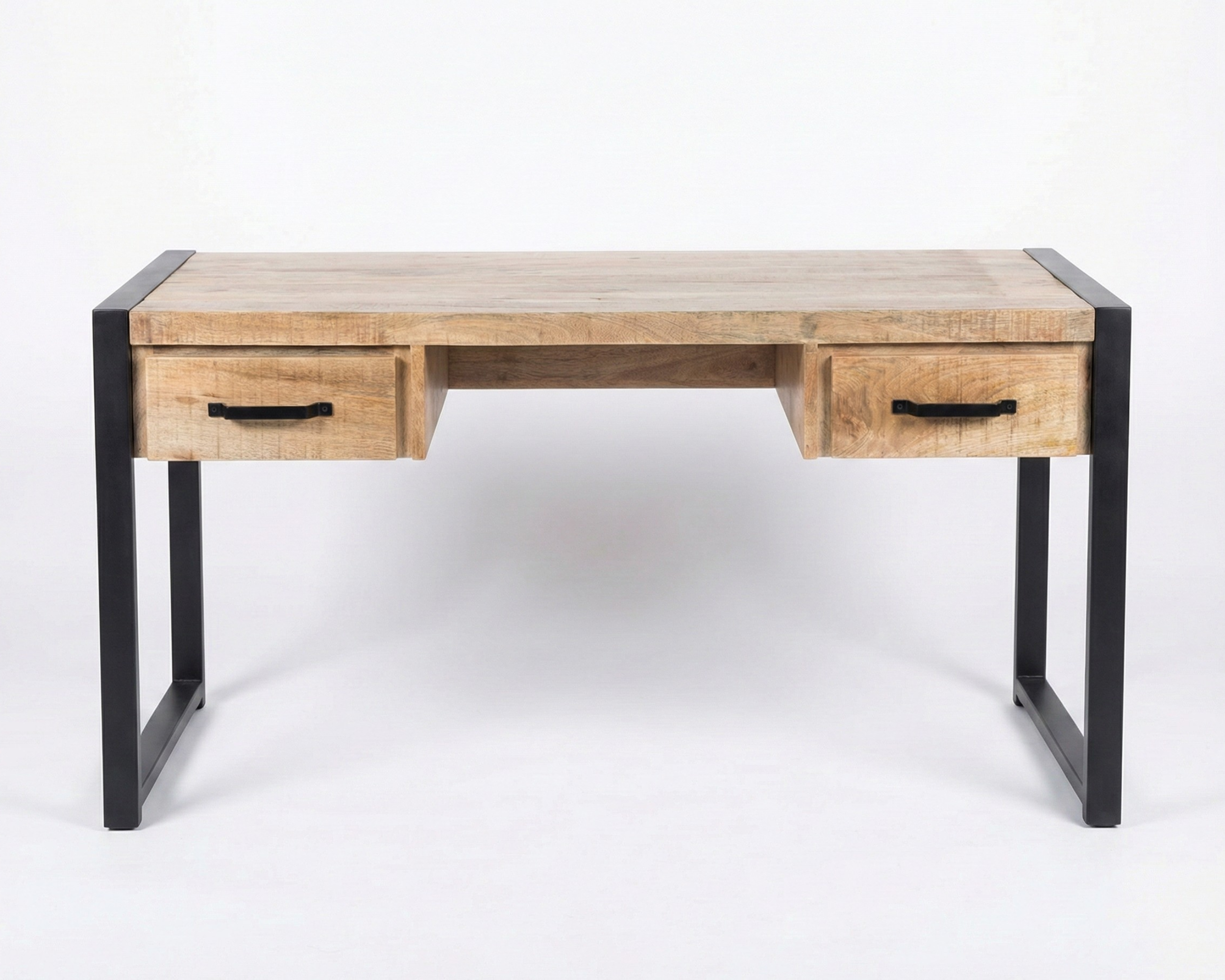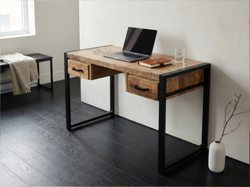 With its large solid mango wood top, this desk will give free rein to your creativity. Mounted on a black metal structure, this modern desk also offers 2 storage drawers decorated with black metal handles. This product is part of the Factory collection. This line of furniture is designed from solid mango wood, which reveals all its charm when in contact with black metal.