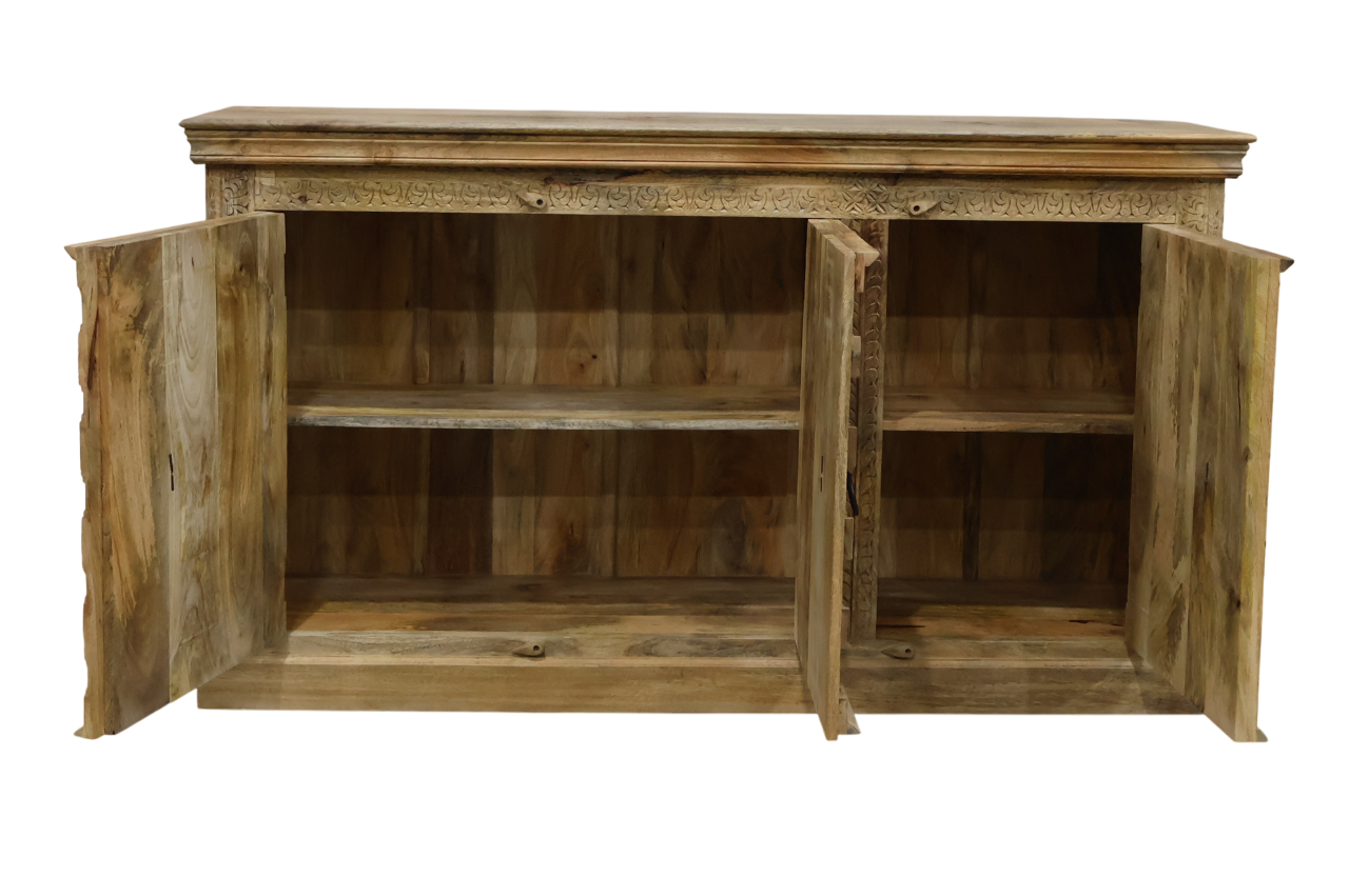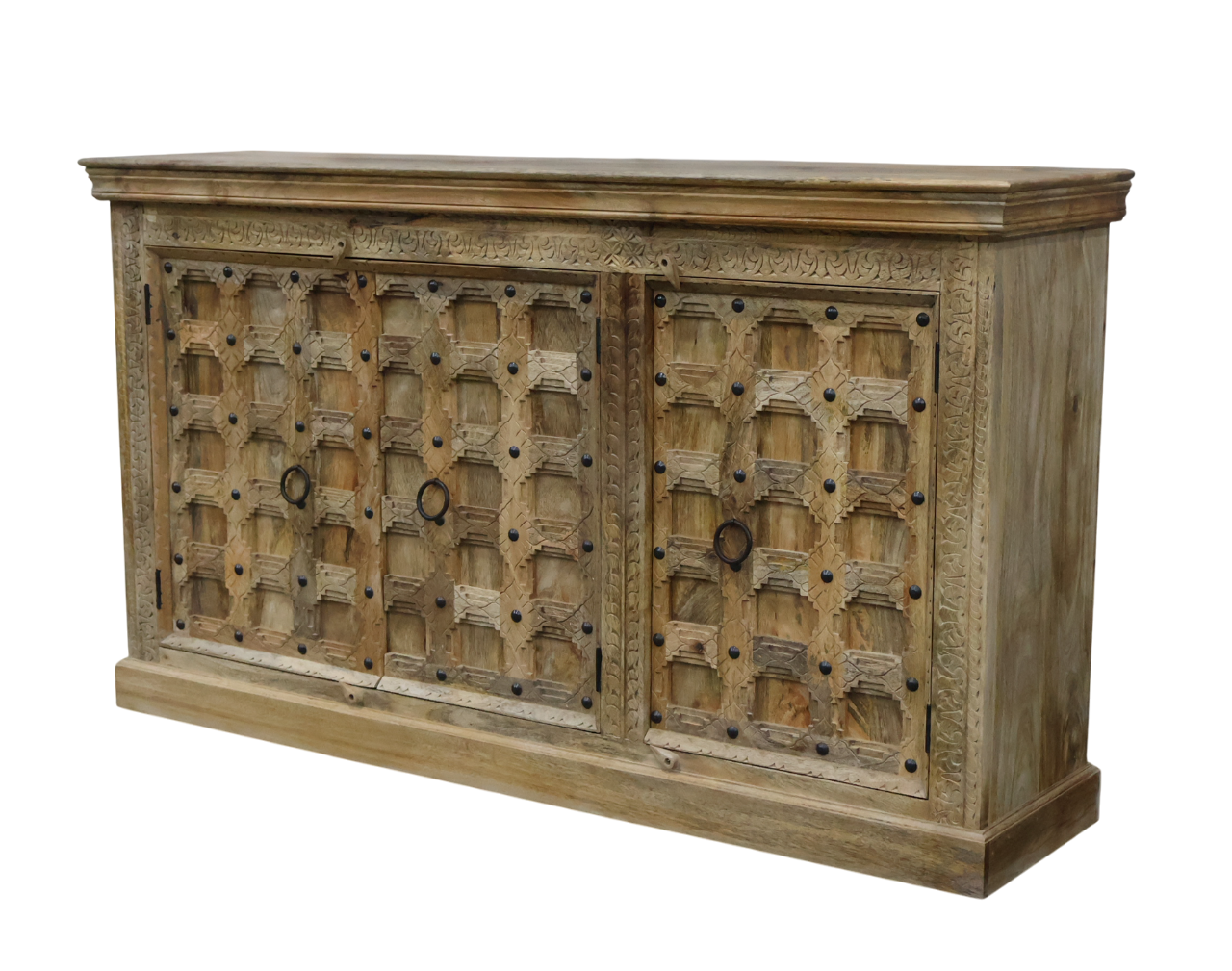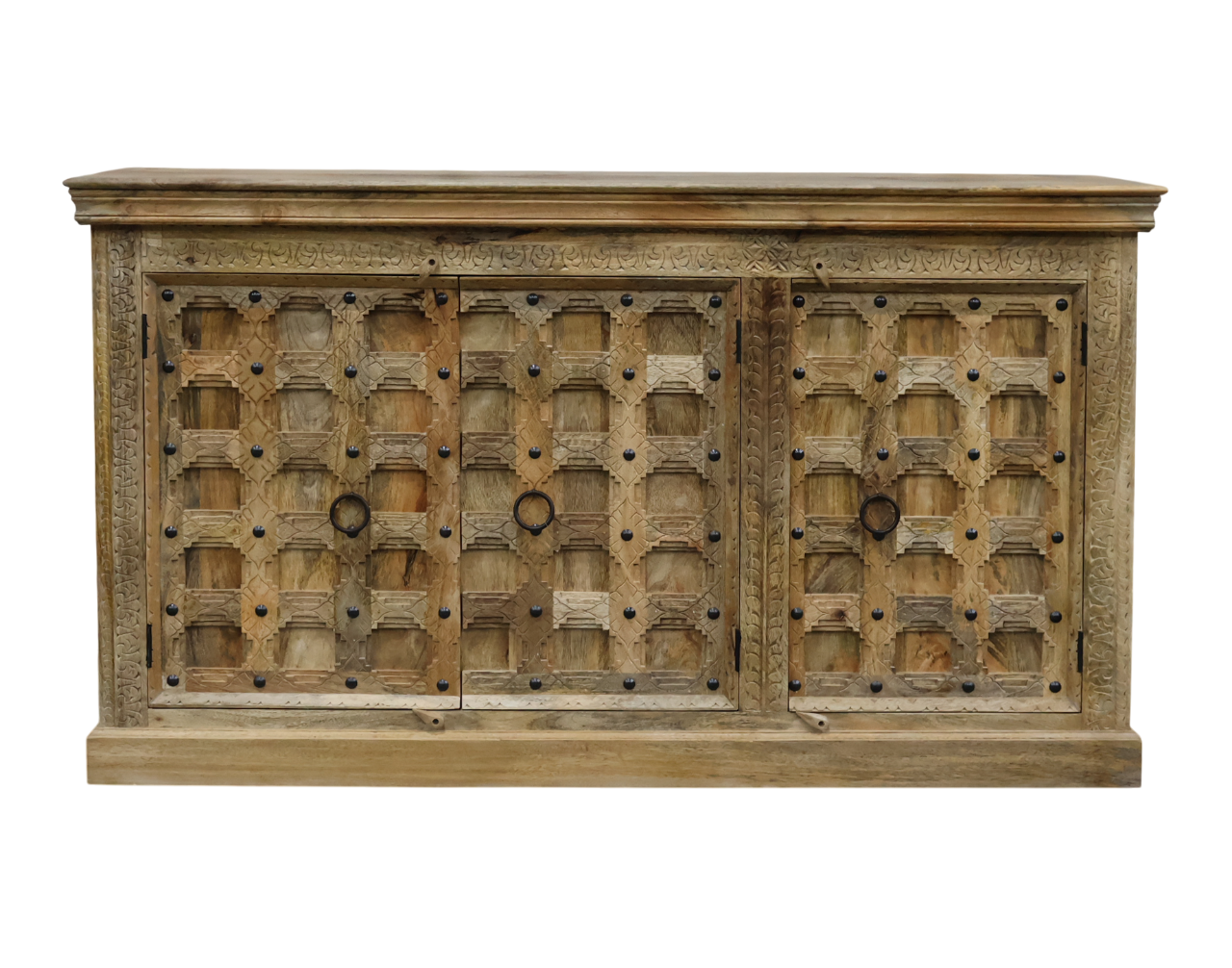 Le buffet BAKHRA s’inspire des anciennes portes indiennes sculptées à la main. Chaque façade présente un travail artisanal riche : motifs géométriques, patine naturelle, clous décoratifs en fer noirci et poignées anneaux typiques des pièces d’architecture traditionnelle.