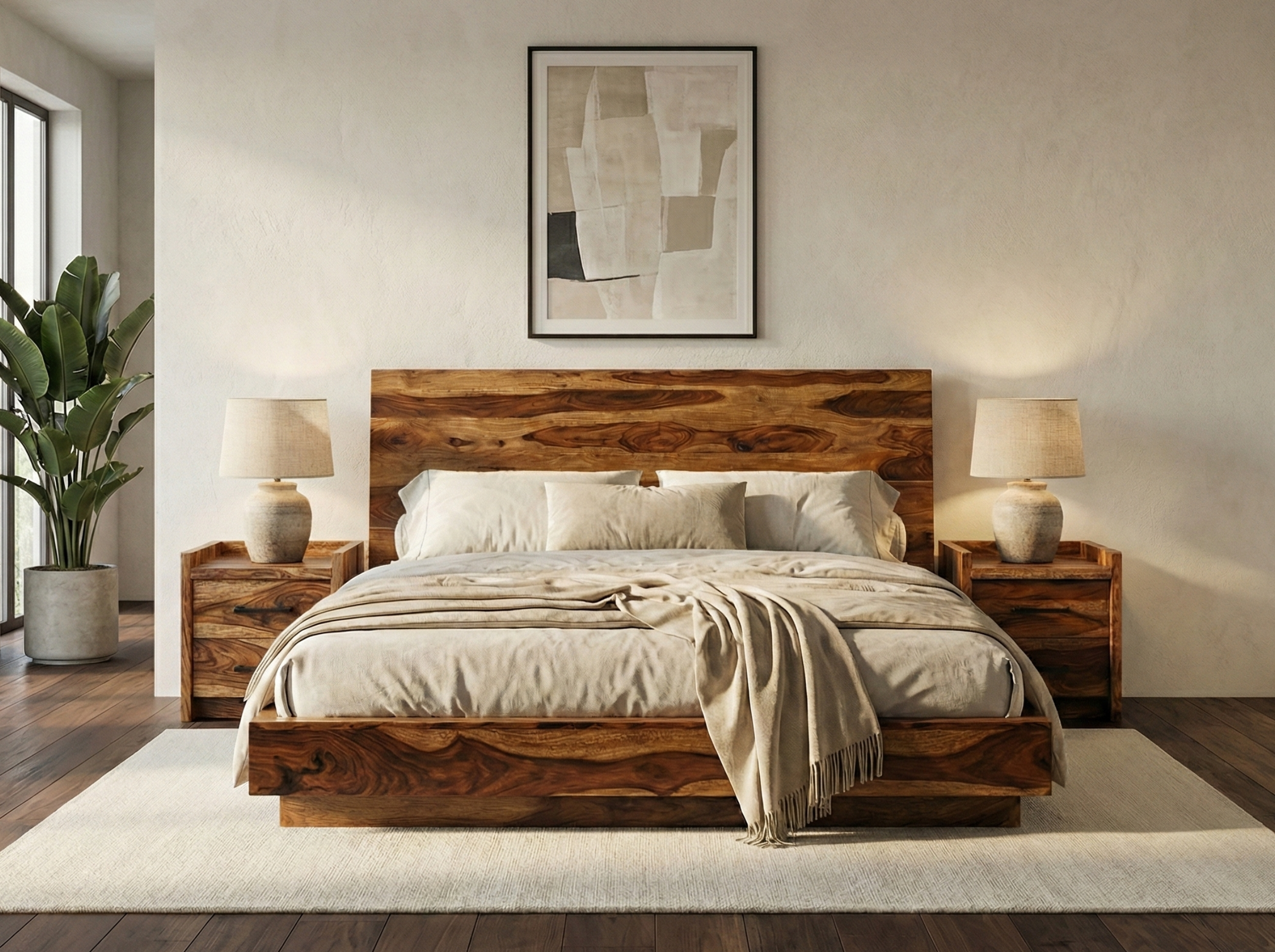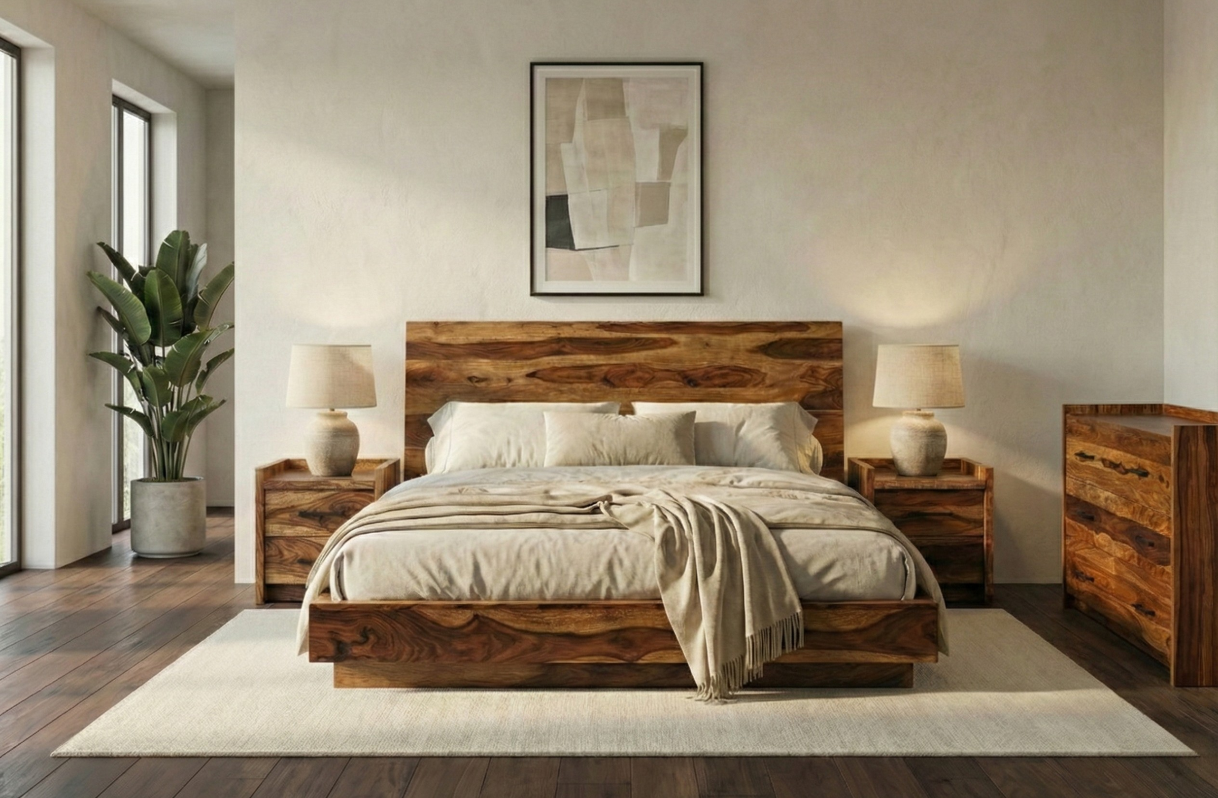 Le lit Nagpur en sheesham massif brun est une pièce maîtresse qui combine design moderne et chaleur organique. Sa silhouette épurée met en valeur un bois noble aux veinures spectaculaires — chaque lit possède son propre dessin naturel, avec des nuances brunes, dorées et miellées qui donnent immédiatement du caractère à la chambre.