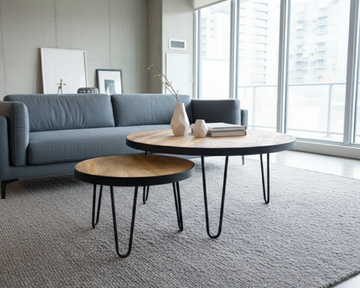 Le contraste bois naturel / piètement fin type hairpin crée une esthétique industrielle légère, idéale pour salon moderne, loft urbain ou condo contemporain.