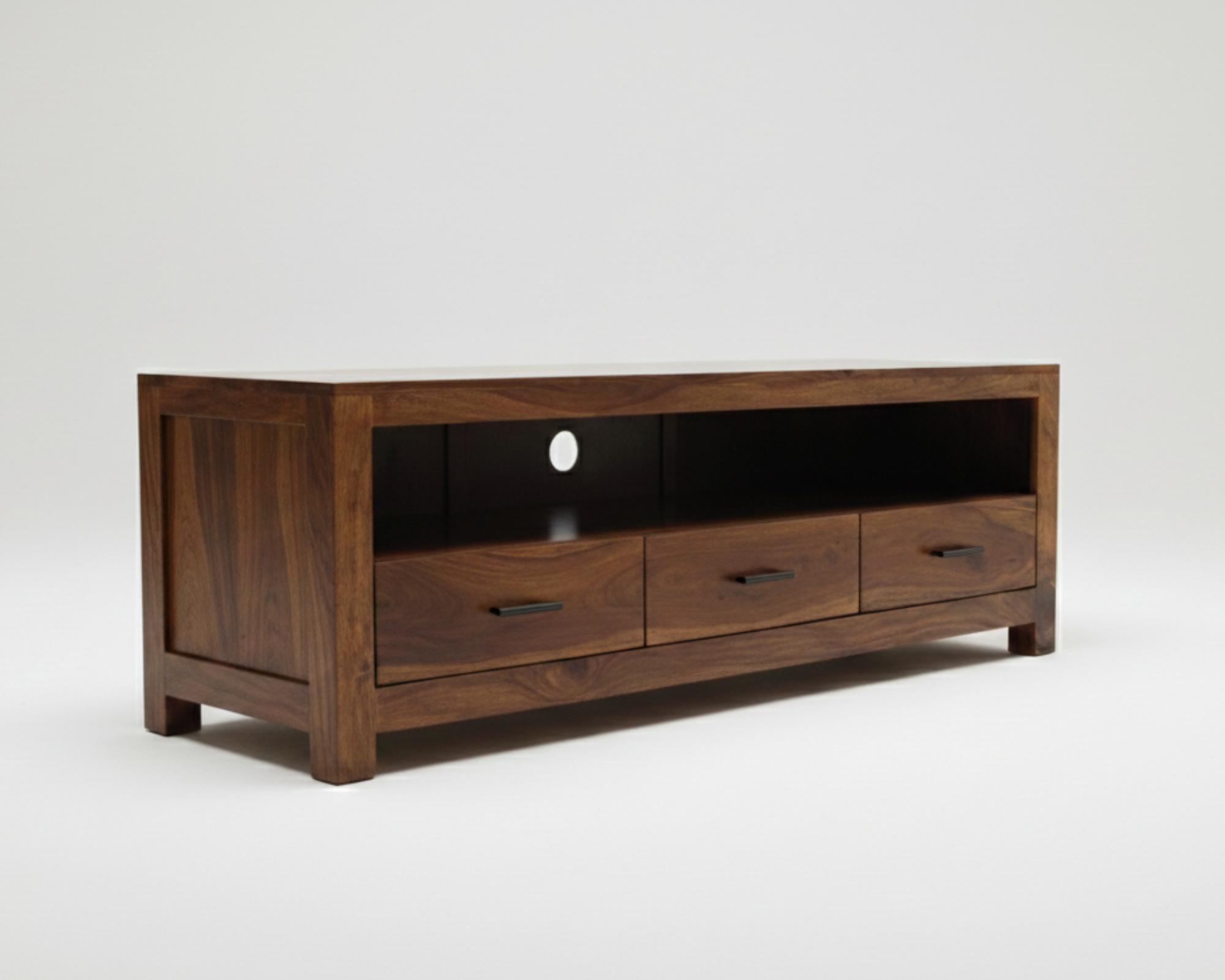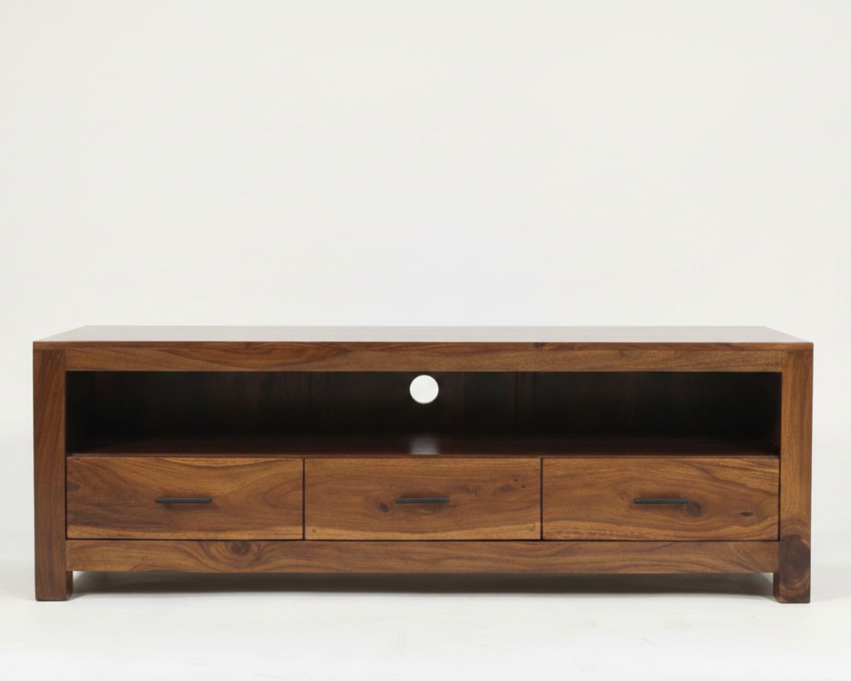 Le meuble TV Enzo se distingue par une silhouette basse et équilibrée, mettant en valeur la richesse naturelle du sheesham massif brun.
