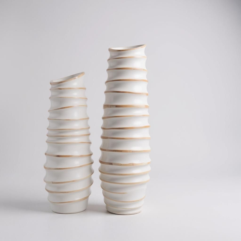 Apportez une touche d’élégance contemporaine à votre intérieur avec ce superbe ensemble de vases artisanaux importés de Thaïlande. Réalisés en bois naturel et habillés de résine blanche, ils se distinguent par leurs lignes organiques et leur finition striée qui jouent avec la lumière.