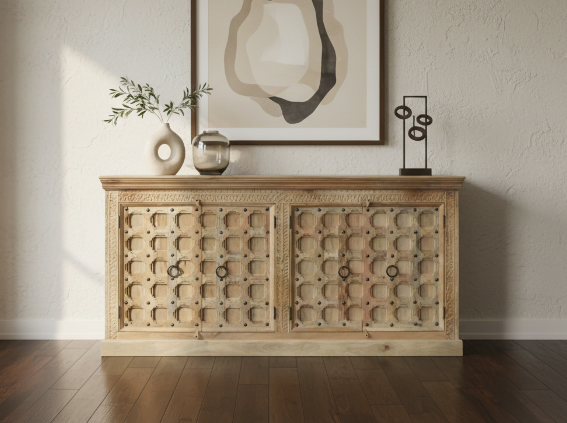 Ce buffet vous offrira un espace pratique où vous pourrez ranger vos plats, verres et autres objets derrière ses 4 superbes portes sculptées à la main. Fabriqué en bois de manguier massif durable, c'est également un meuble chic dans l'air du temps.