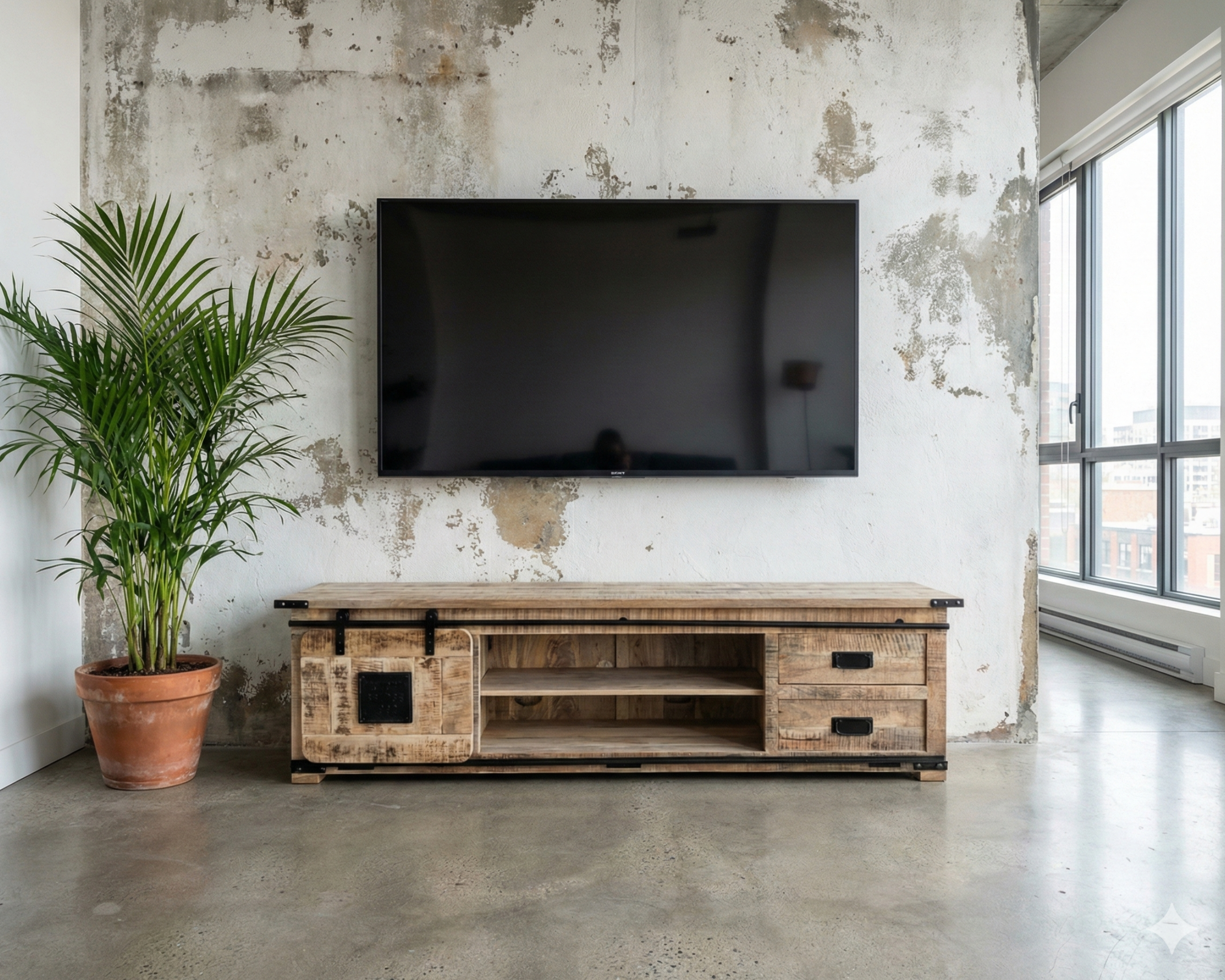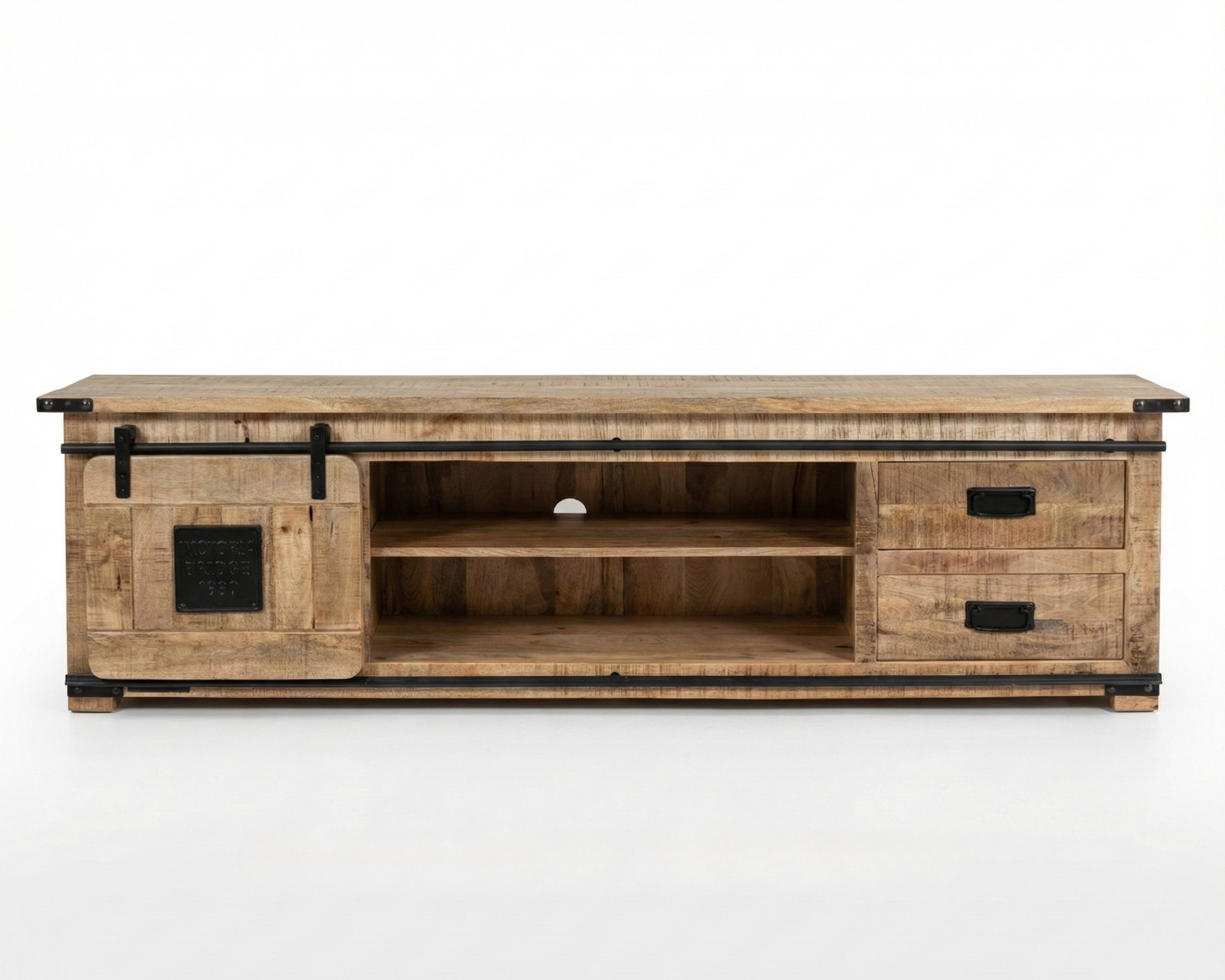 Fabriqué en bois de manguier massif, le meuble repose sur une structure solide renforcée par des éléments métalliques inspirés des portes coulissantes industrielles.