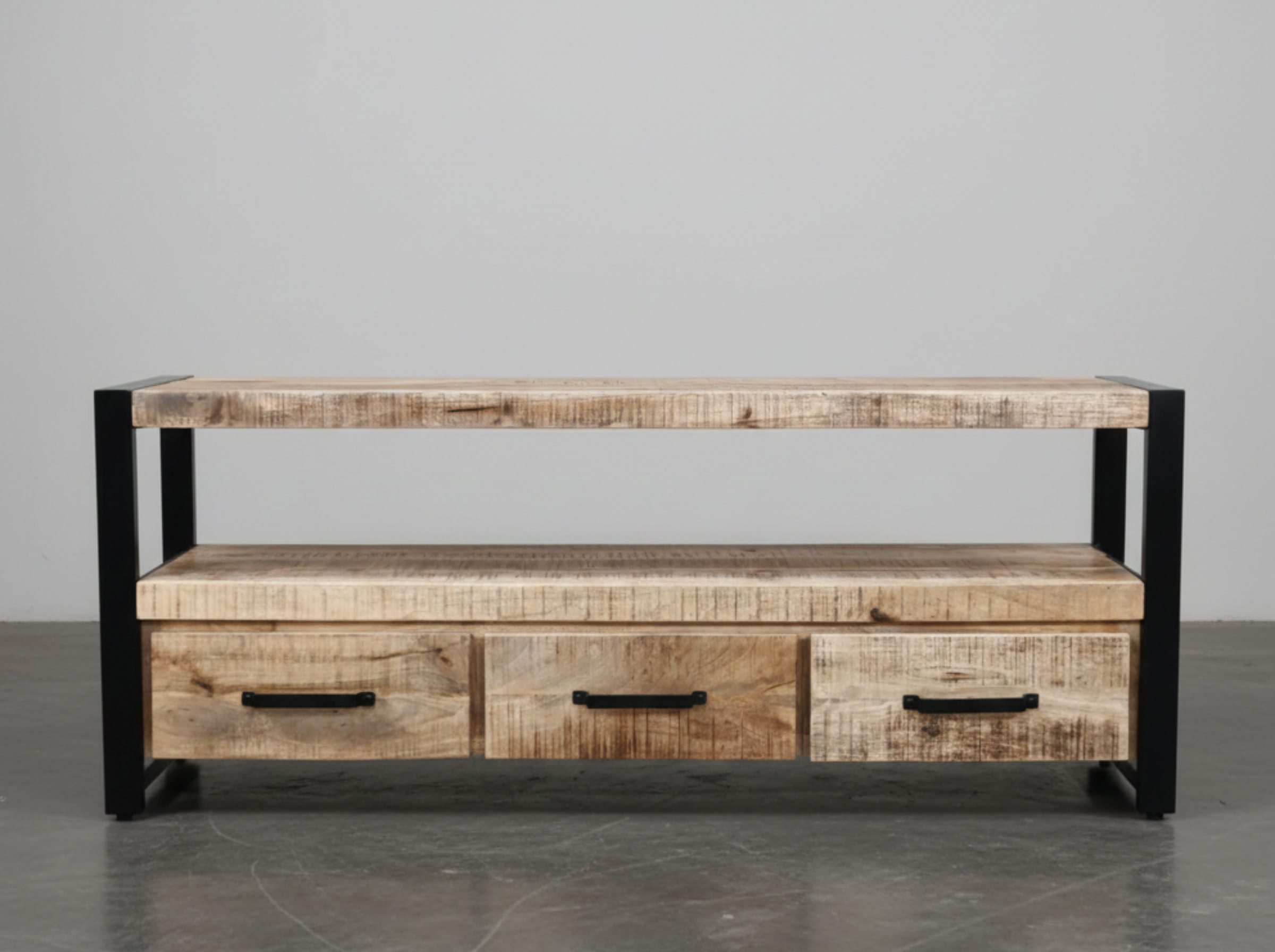 芒果木和黑色金属制成的 Factory 电视柜兼具实用性和美观性,将很快成为您室内装饰的必备品。